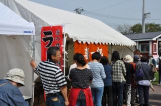 本日の門別競馬場では「秋の収穫祭」を開催し、天候にも恵まれ多くのお客様がご来場されました。中でも、新冠町の国道沿いにお店を構え、先日、札幌オータムフェスト2014にも出店した人気ラーメン店「喜一郎」が特別出店いたしました。正午の開門と同時に店の前には長蛇の列ができ、価格も500円とリーズナブルで、大変好評得ていました。