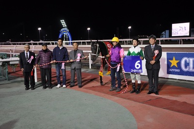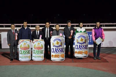 10月21日(火)、今年から重賞に格上げされた、サッポロビール協賛 未来優駿2014 第1回サッポロクラシックカップ【H2】(ダート1,200m 曇・重)が行われ、2番人気コールサインゼロ号が2着チェリーサマー号にアタマ差をつけて優勝しました(タイム:1.13.7)。