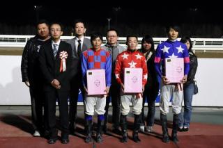 トータル35点を獲得した五十嵐 冬樹騎手が見事総合優勝となり、2位は27点を獲得した松井 伸也騎手、3位は阿部 龍騎手と宮崎 光行騎手が26点で同点となりましたが、8Rで2着となった阿部 龍騎手が3位になり、上位3名に副賞としてみついし和牛の詰め合わせが贈呈されました。