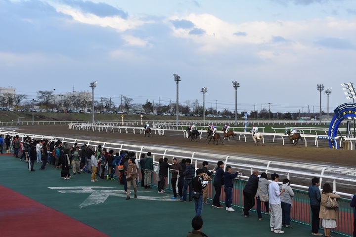 春のケイバまつり2日目の門別競馬場は、開門時には雨が降っていたものの、天候は第2競走ごろには回復し、多くのファンで賑わっていました。