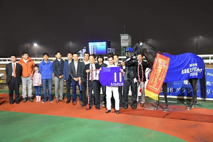 本日のメイン競走、農林水産大臣賞典 日刊スポーツ賞 第20回 北海道スプリントカップ【JpnⅢ】[ダート1,200m(外) 雨・不良]が行われ、1番人気ダノンレジェンド号が2着ノボバカラ号にハナ差をつけて優勝しました(タイム:1.09.9)。
