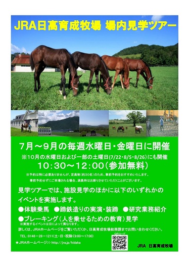 JRA日高育成牧場 場内見学ツアーのご案内 その他 2017.07.13 JRA日高育成牧場では場内見学ツアーを実施しております。 詳しい内容につきましてはJRAホームページにてご確認ください。 JRAホームページ(日高育成牧場場内見学ツアー)