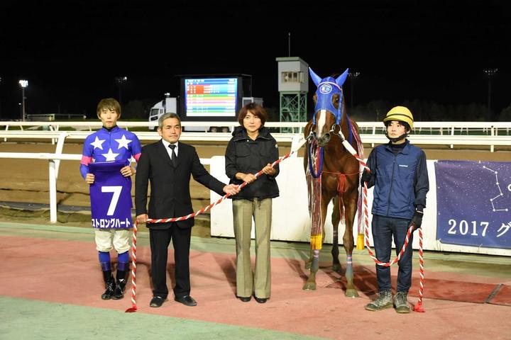 本日のメイン競走、HTB杯 第14回 リリーカップ〔H3〕(ラブリーデイ賞)[ダート1,200m (外) 晴 ・ 稍重]が行われ、4番人気ストロングハート号が2着グラヴィオーラ号に3/4馬身差をつけて優勝しました(タイム:1.13.6)。