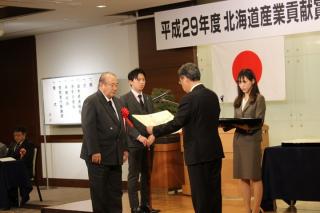 北海道産業貢献賞は、多年に渡り北海道農業の発展に貢献し、その功績が顕著な人物または団体に贈られるもので、桑原義光元調教師はホッカイドウ競馬の騎手としての活躍や調教師として1,400勝を上げた成績に加え、リーディングジョッキーを育てる巧みな教育手法、北海道調騎会の役員として重要な職責を果たすなど、北海道競馬界の発展に多大な貢献をしたことが認められ、この度の受賞となりました。