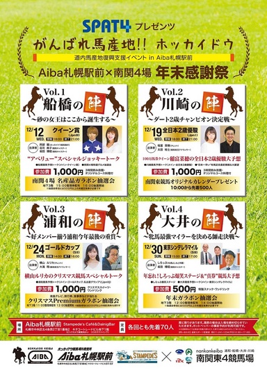 Aiba札幌駅前において、12月12日(水)、19日(水)、24日(月・祝)、30日(日)に「SPAT4プレゼンツ Aiba札幌駅前×南関4場年末感謝祭」が開催されます。ゲストを招いてのトークイベント、抽選会などを予定。(イベントの詳細についてはこちらから)。お近くの方はぜひ足をお運びください。