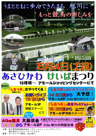 Aiba旭川のあるアモールショッピングセンターにおいて、5月4日(土)に、「あさひかわ けいばまつり」として「『しろっぷ』お笑いライブ」や抽選会などのイベントが実施されますので、お近くの方はぜひ足をお運びください。