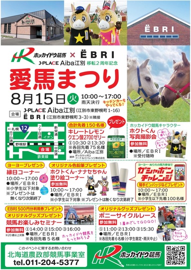 Aiba江別が移転後2周年を迎えることから、隣接する江別市の商業施設「EBRI」様と連携し「愛馬まつり」を開催します。