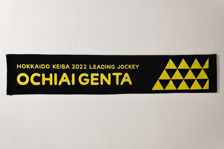 お待たせしました!2022シーズンに初めてリーディングを獲得した落合玄太騎手のオリジナルグッズ・マフラータオルが完成いたしました。落合騎手の初リーディング獲得を記念して、「落合玄太騎手サイン入りマフラータオル」を10名様にプレゼントいたします。ご希望の方は専用の応募フォームよりご応募ください。皆様のご応募をお待ちしております。