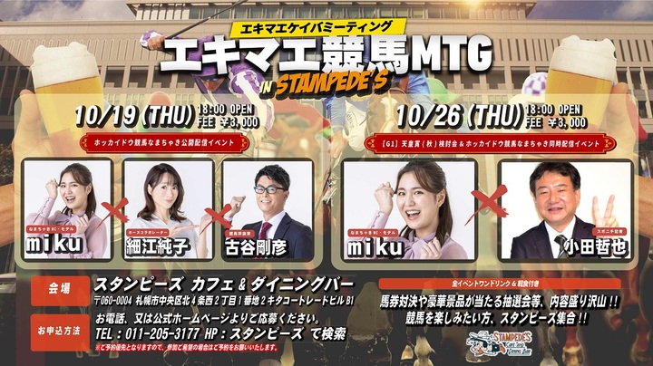 Aiba札幌駅前の「スタンピーズカフェ&ダイニングバー」では、10月19日(木)、26日(木)にエキマエ競馬MTGイベントを実施いたしますので、皆さまぜひお越しください。