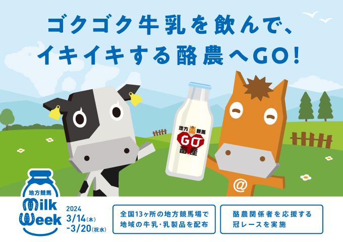 地方競馬では、3月14日(木)から20日(水)までの7日間を「地方競馬ミルクウィーク」と題し、牛乳・乳製品の消費拡大につながるPR活動を通じて日本の酪農を応援する取組を実施します。