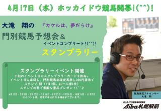 Aiba札幌駅前では、4月17日(水)にホッカイドウ競馬開幕イベントを実施いたします。競馬実況アナウンサー大滝翔さんによる門別競馬場予想会&イベントコンプリートを行いますので、皆さまぜひお越しください。