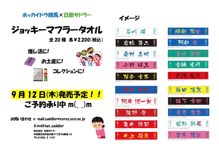 門別競馬場のすぐそば、北の馬具屋「日胆サドラー」様とのコラボ企画、ホッカイドウ競馬ジョッキーマフラータオル全20種が9月12日(木)に日胆サドラーで発売して頂くことが決定しました。