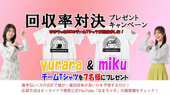 今回のプレゼントは、お待たせしました!なまちゃきMCのチームTシャツが完成しました。10月2日(水)は「TEAM miku」Tシャツを10月3日(木)は「TEAM yurara」Tシャツをそれぞれ7名様にプレゼントいたしますので、奮ってご応募ください。