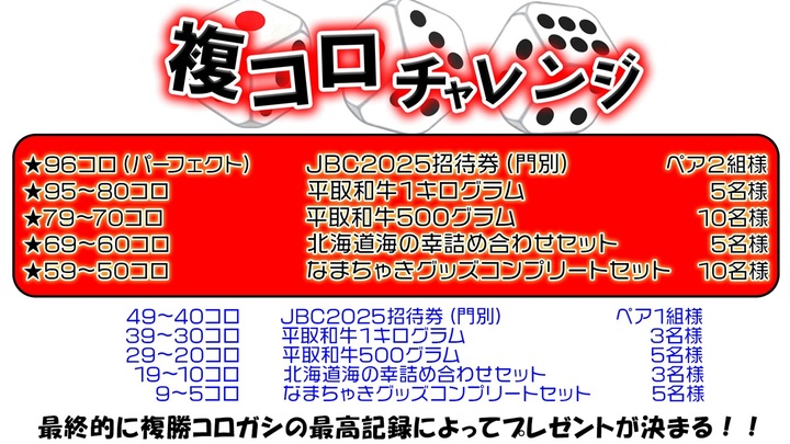 さらに、こちらも新企画として「複コロチャレンジ」もスタート!こちらは、以前の夢馬券企画の進化版として実施。視聴者の皆様とトヨDが一緒になって、最終日の期間中に複勝コロガシの最高記録数によってプレゼント賞品が決まる視聴者参加型企画となっております。現在の最高記録は、4コロ。5コロからプレゼント企画が発動しますので、なんとか5コロ以上を目指したいところです。