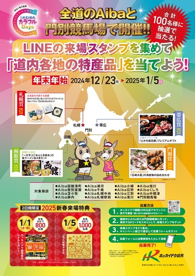また、新春来場特典として1月1日(水・祝)と1月5日(日)には、先着プレゼントもありますので、お近くにお越しの際は、ホッカイドウ競馬場外発売所Aiba(J-PLACE)および門別競馬場にご来場ください。