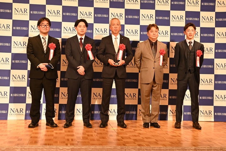 NARグランプリ2024表彰式 その他 2025.02.03 2024年に優秀な成績をおさめた地方競馬の人馬や、地方競馬の発展に功績のあった人馬等を顕彰する「NARグランプリ2024」の表彰式が2月3日(月)に東京都内のホテルで行われました。 【ホッカイドウ競馬表彰馬・表彰者】 ※馬の年齢は、すべて2024年時点 ■2歳最優秀牡馬 ソルジャーフィルド号(2歳 川島洋人きゅう舎) 主戦騎手/小野楓馬騎手