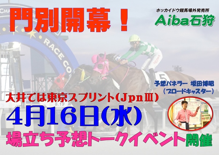 Aiba石狩では、4月16日(水)に門別開幕イベントを実施いたします。ブロードキャスター坂田博昭さんによる場立ち予想トークを行いますので、皆さまぜひお越しください。